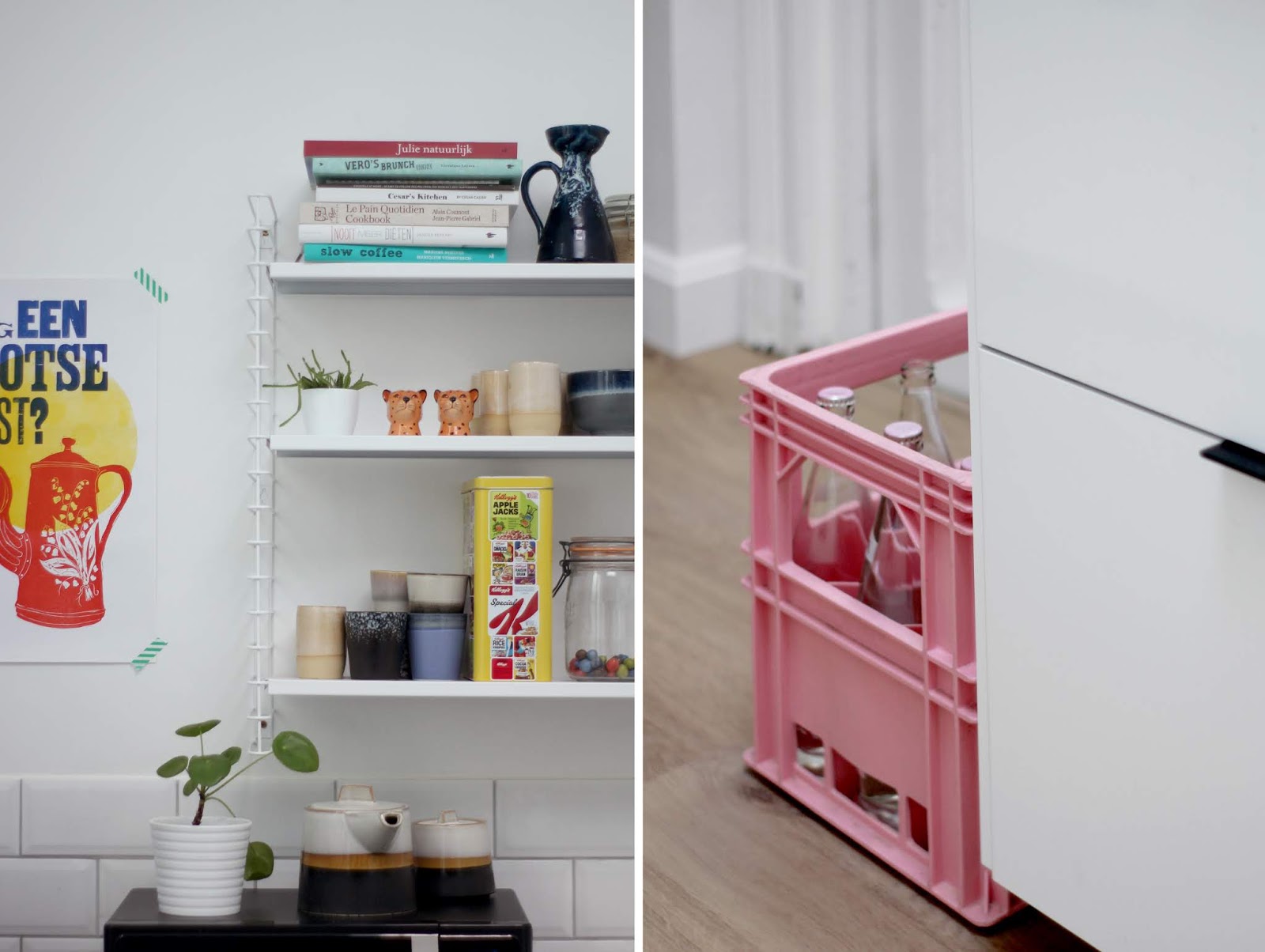 poster: MIAT Gent / blauwe kruik: tweedehands / wit bloempotje: IKEA, peper-en zoutvat: JUTTU, beige keramieken mokken: Atelier Ansofie, blauwe kom: HKLiving / meerkleurige mokken: HKLiving, cornflakesdoos: Kellogg's, djar: tweedehands / witte bloempot met pannenkoekplant: IKEA, theepot + suikerpot: HKLiving / roze krat: Evian